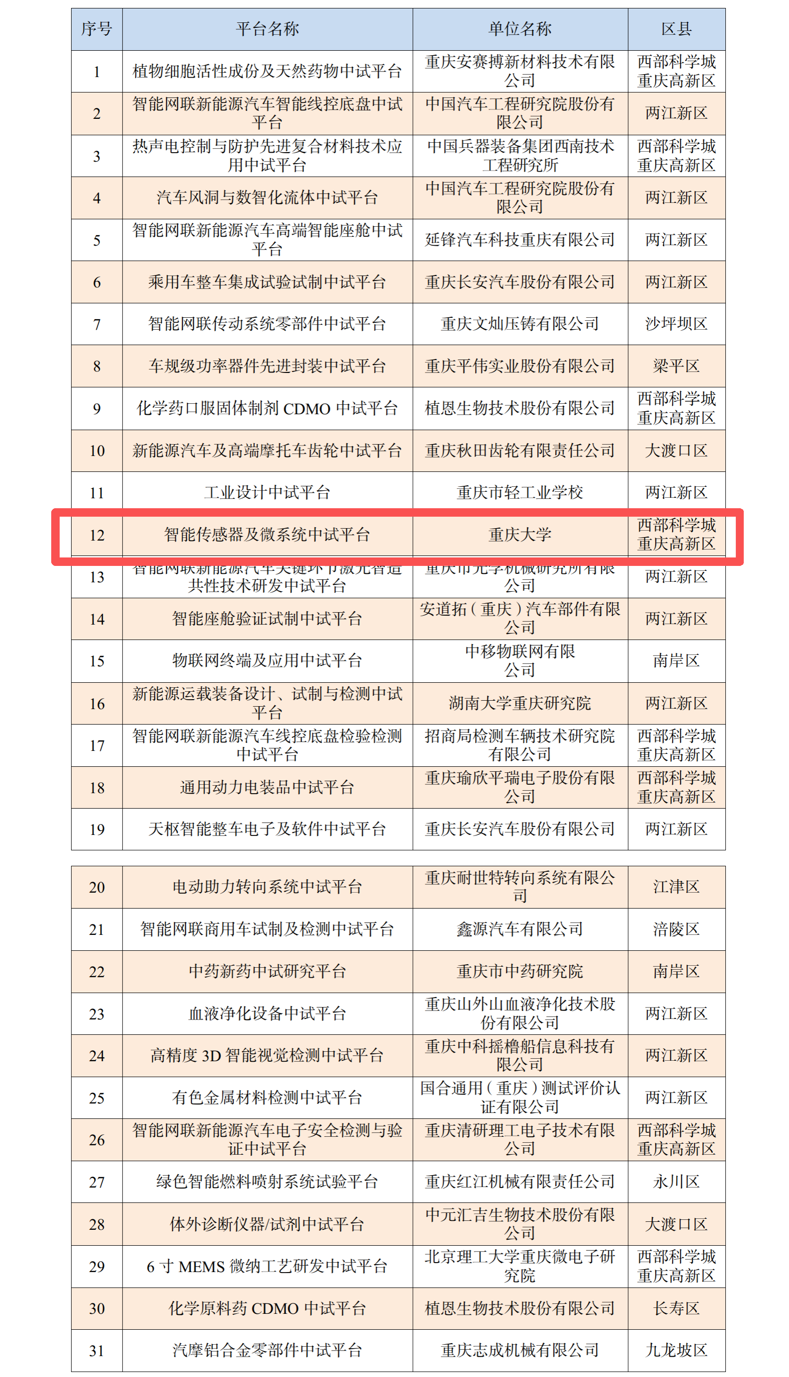 重庆大学智能传感器及微系统中试平台入选拟认定名单